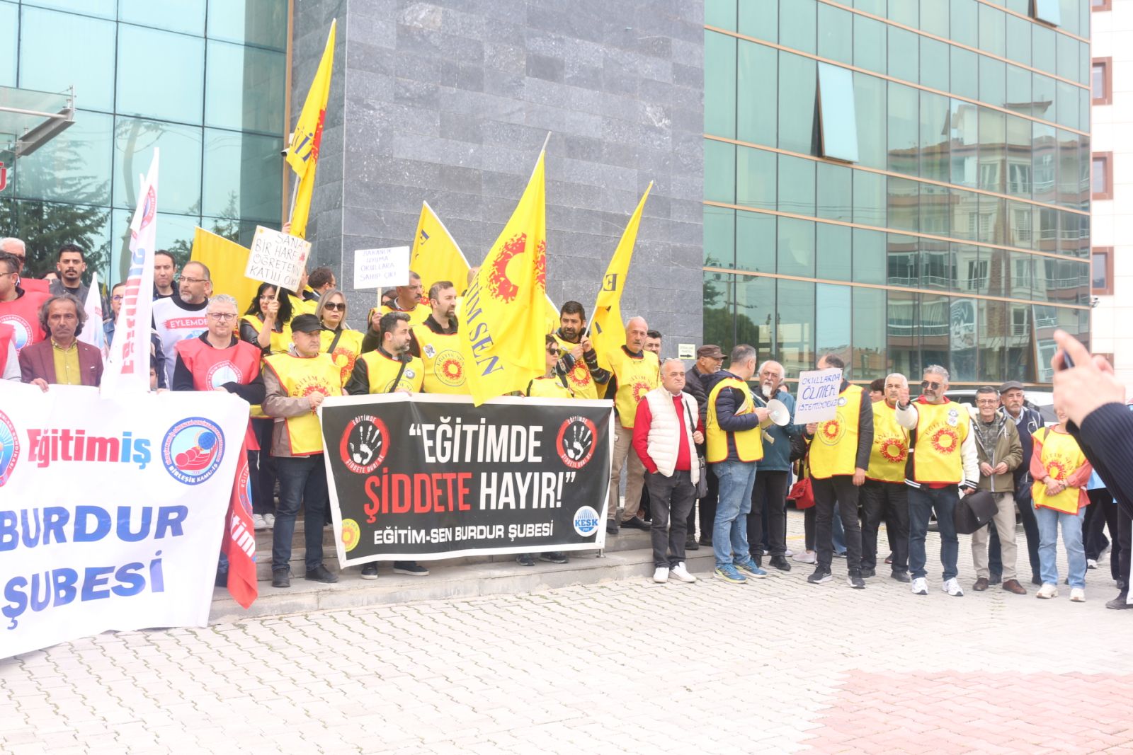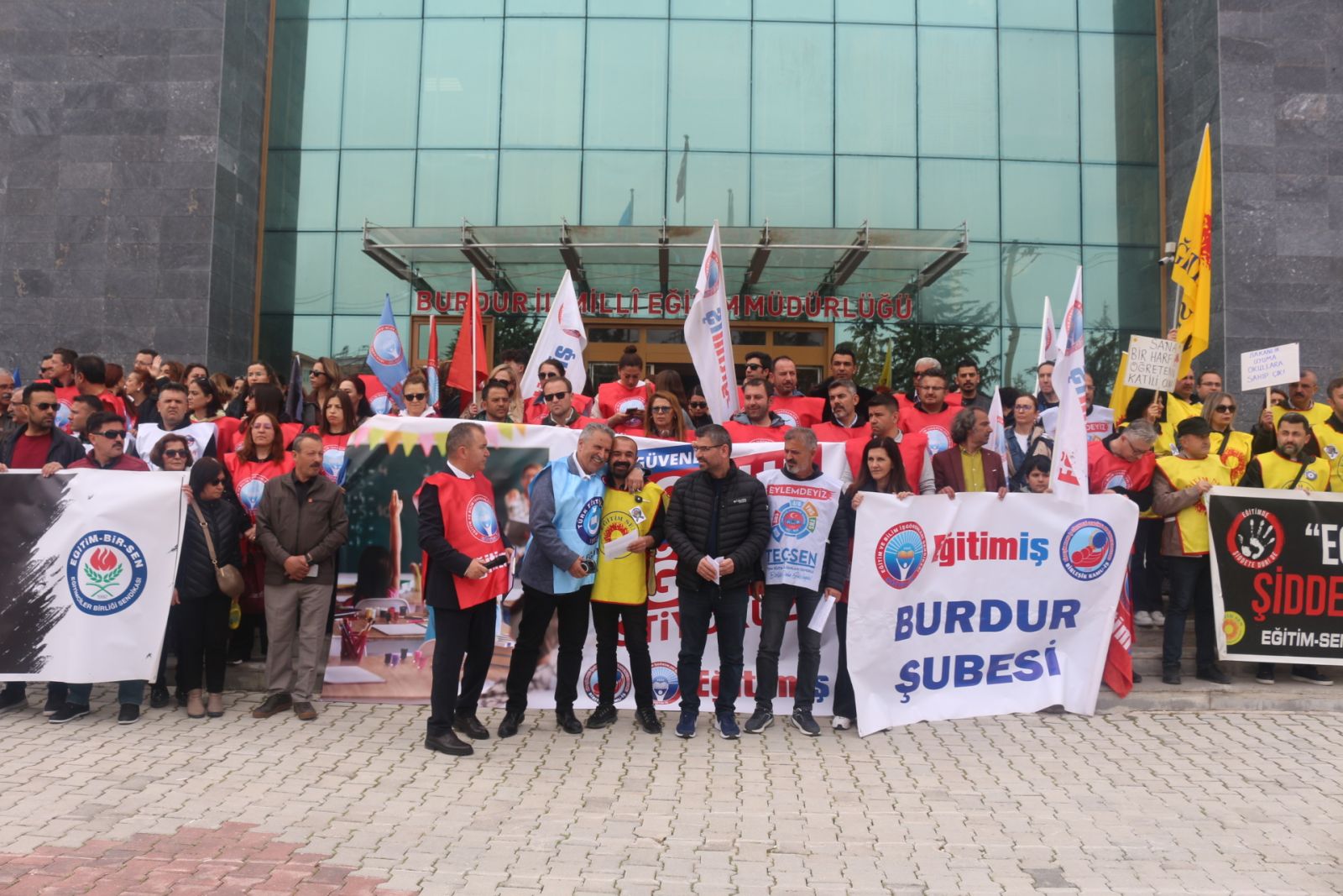 Burdur’da eğitim sendikaları, eğitimde yaşanan şiddet olaylarına tepki göstermek amacıyla saat 13.00’da Burdur İl Milli Eğitim Müdürlüğü önünde basın açıklaması gerçekleştirdi.
