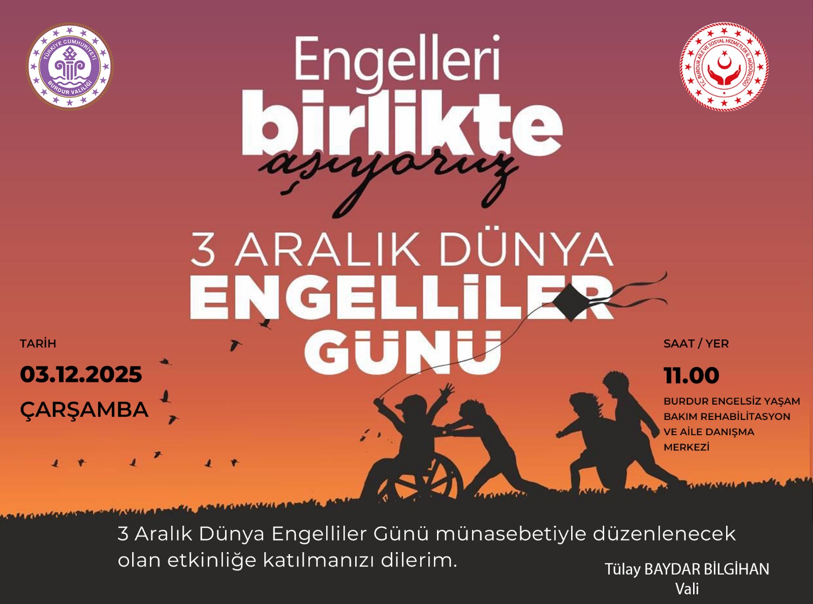 Burdur Valiliği, 3 Aralık Dünya Engelliler Günü kapsamında farkındalık oluşturmak amacıyla özel bir etkinlik programı düzenleyecek. “Engelleri Birlikte Aşıyoruz” temasıyla hazırlanan etkinlik, 3 Aralık 2025 Çarşamba günü saat 11.00’de Burdur Engelsiz Yaşam Bakım Rehabilitasyon ve Aile Danışma Merkezi’nde gerçekleştirilecek.