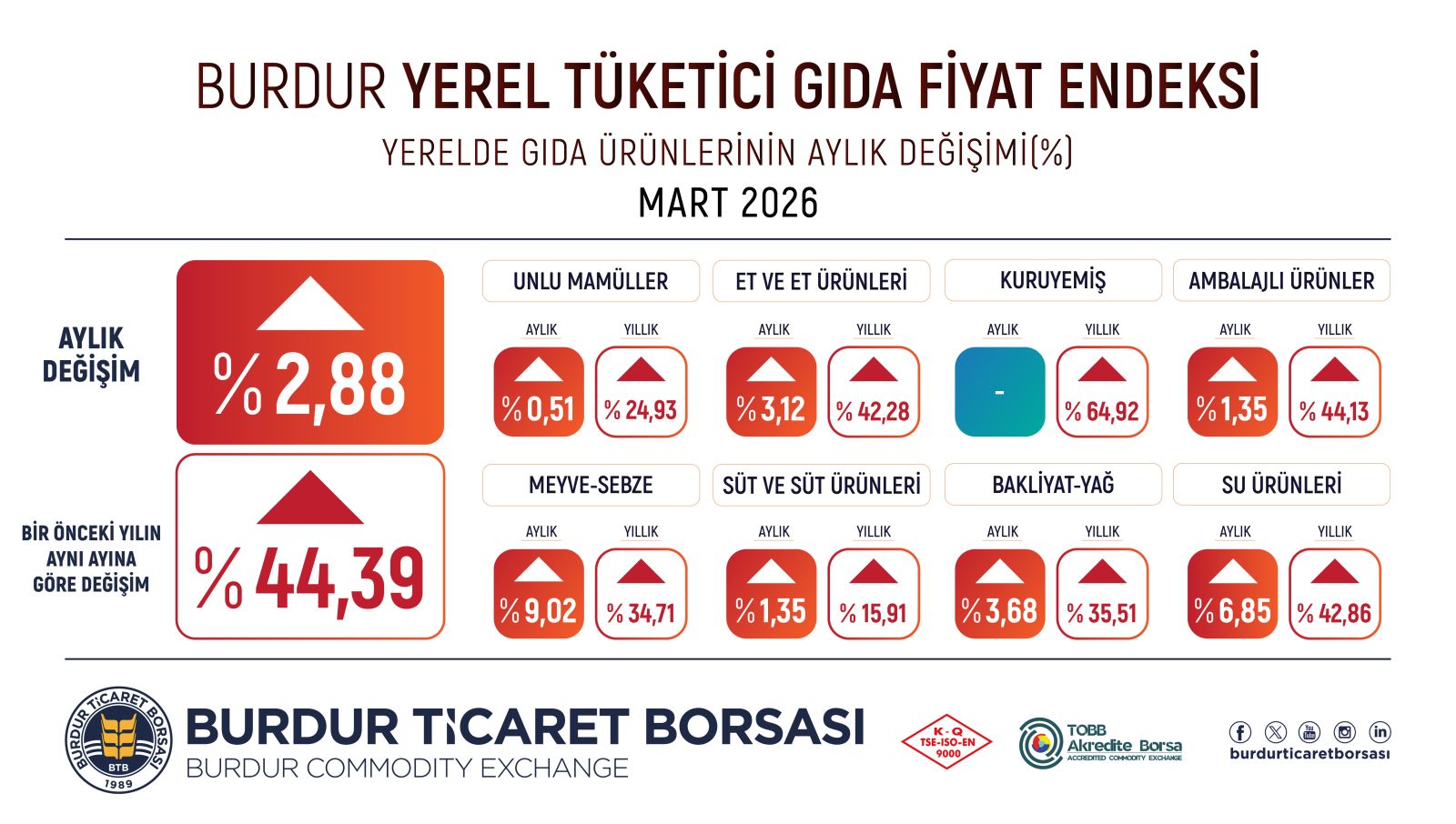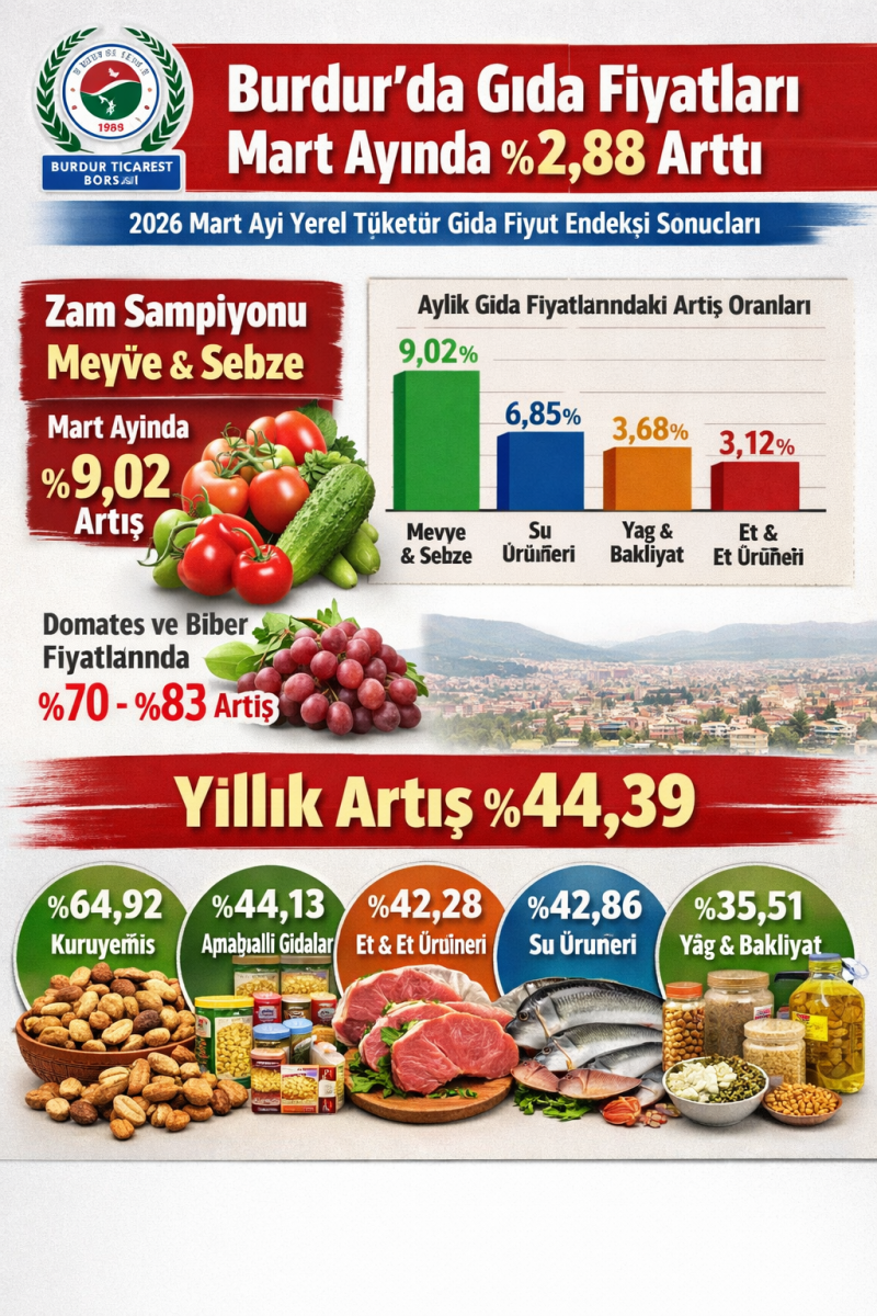 Burdur Ticaret Borsası tarafından hazırlanan Yerel Tüketici Gıda Fiyat Endeksi sonuçlarına göre, Mart ayında gıda fiyatları yüzde 2,88 oranında arttı. Bir önceki yılın aynı ayına göre Burdur’da gıda fiyatlarının yüzde 44,39 oranında yükseldiği tespit edildi.