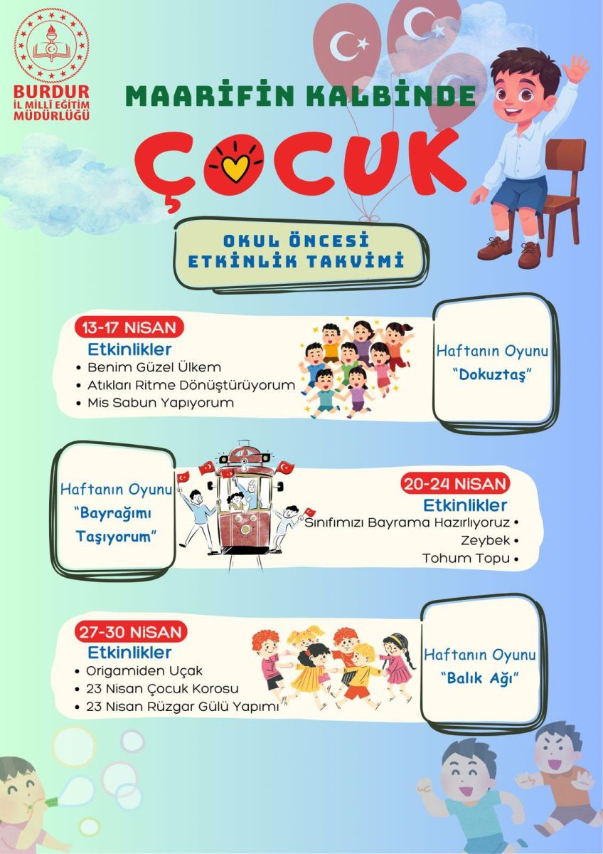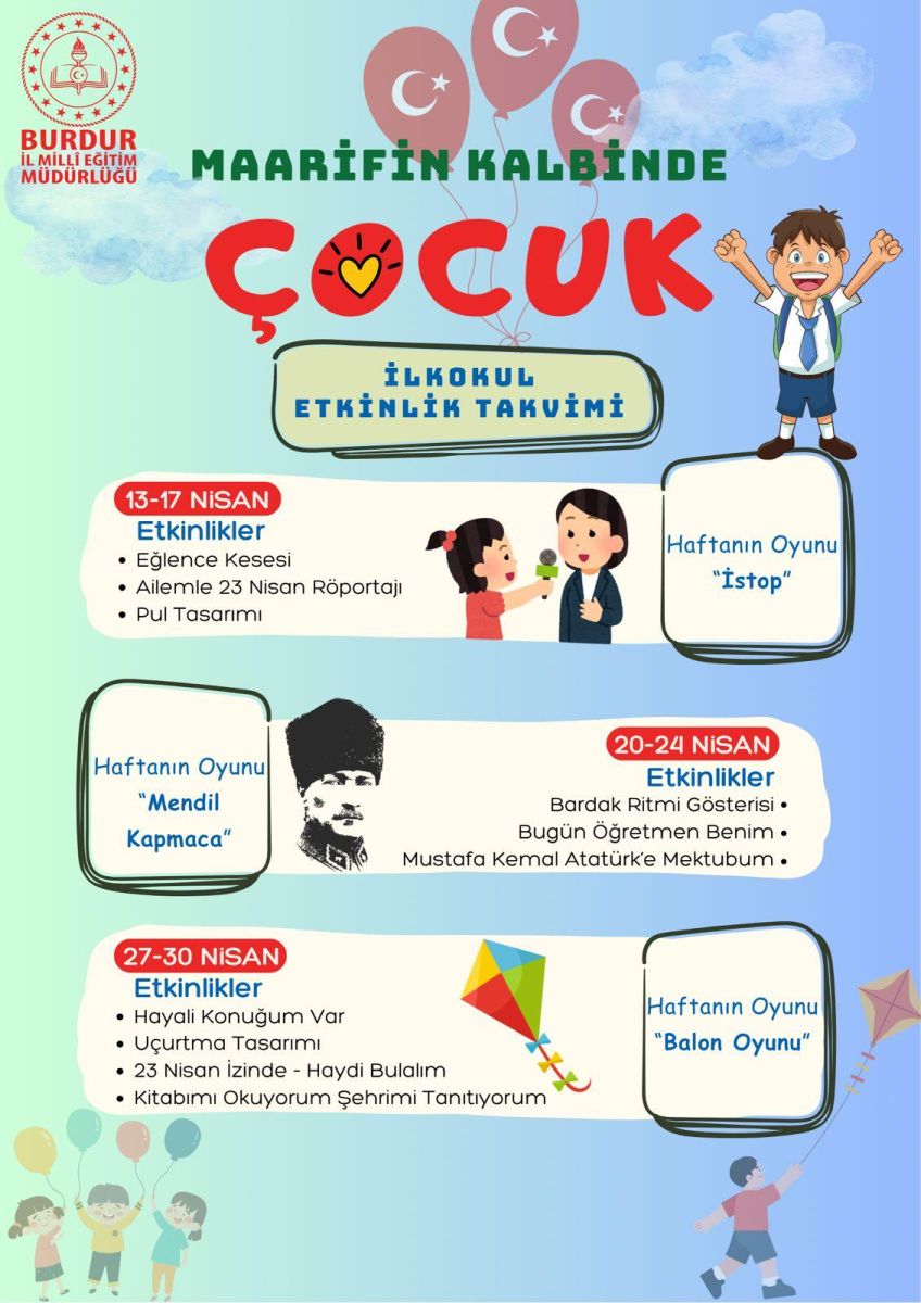 Burdur İl Millî Eğitim Müdürlüğü, Nisan ayı boyunca öğrenciler için hem eğitici hem de eğlenceli etkinliklerle dolu kapsamlı bir program hazırlıyor. Milli Eğitim Bakanlığı tarafından belirlenen programlar doğrultusunda planlanan etkinlikler, 23 Nisan Ulusal Egemenlik ve Çocuk Bayramı coşkusunu tüm aya yaymayı hedefliyor.
