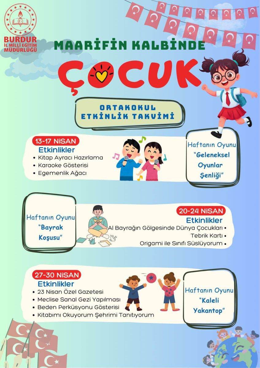 “Maarif’in Kalbinde Çocuk” temasıyla hazırlanan program kapsamında, okul öncesinden ortaokul seviyesine kadar tüm öğrencilerin aktif katılım sağlayabileceği çok sayıda etkinlik düzenlenecek. 13-30 Nisan tarihleri arasında gerçekleştirilecek organizasyonlar, çocukların hem sosyal hem de bilişsel gelişimine katkı sunmayı amaçlıyor.