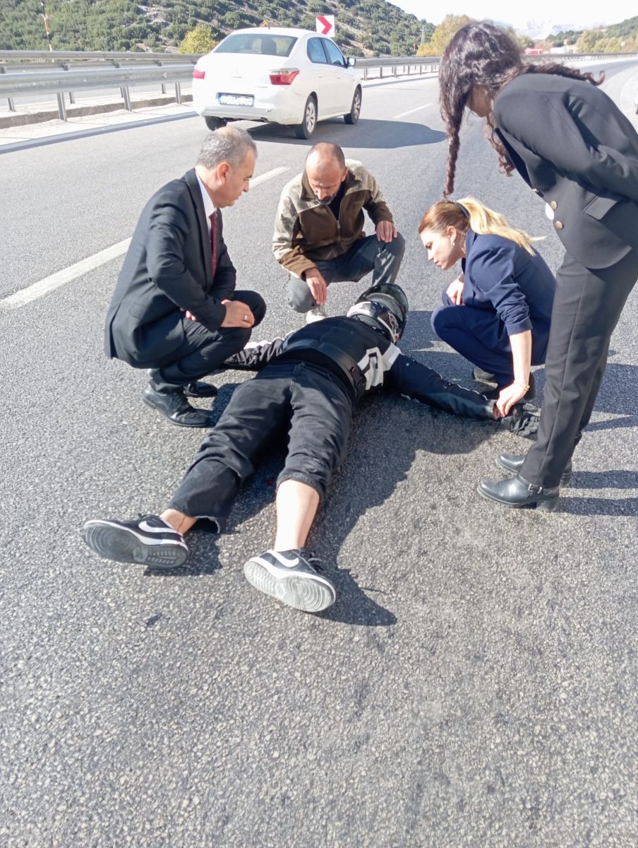 Burdur – Ankara karayolu üzerine Bucak’tan motosikleti ile Burdur’a gelen sürücü Tekke Köyü yakınlarında direksiyon hakimiyeti kaybetmesi sonucu yol kenarındaki bariyerlere çarptı. Şans eseri bugün öğle saatlerinde o güzergahtan geçen Burdur Aile ve Sosyal Hizmetler Burdur il Müdürü Mustafa Çakır, ve beraberindeki aynı zaman da sağlık görevlisi paramedik il müdür yardımcısı Eylem Çavdar yaptı. Ardından kontrol amacıyla hastaneye sevk edildi