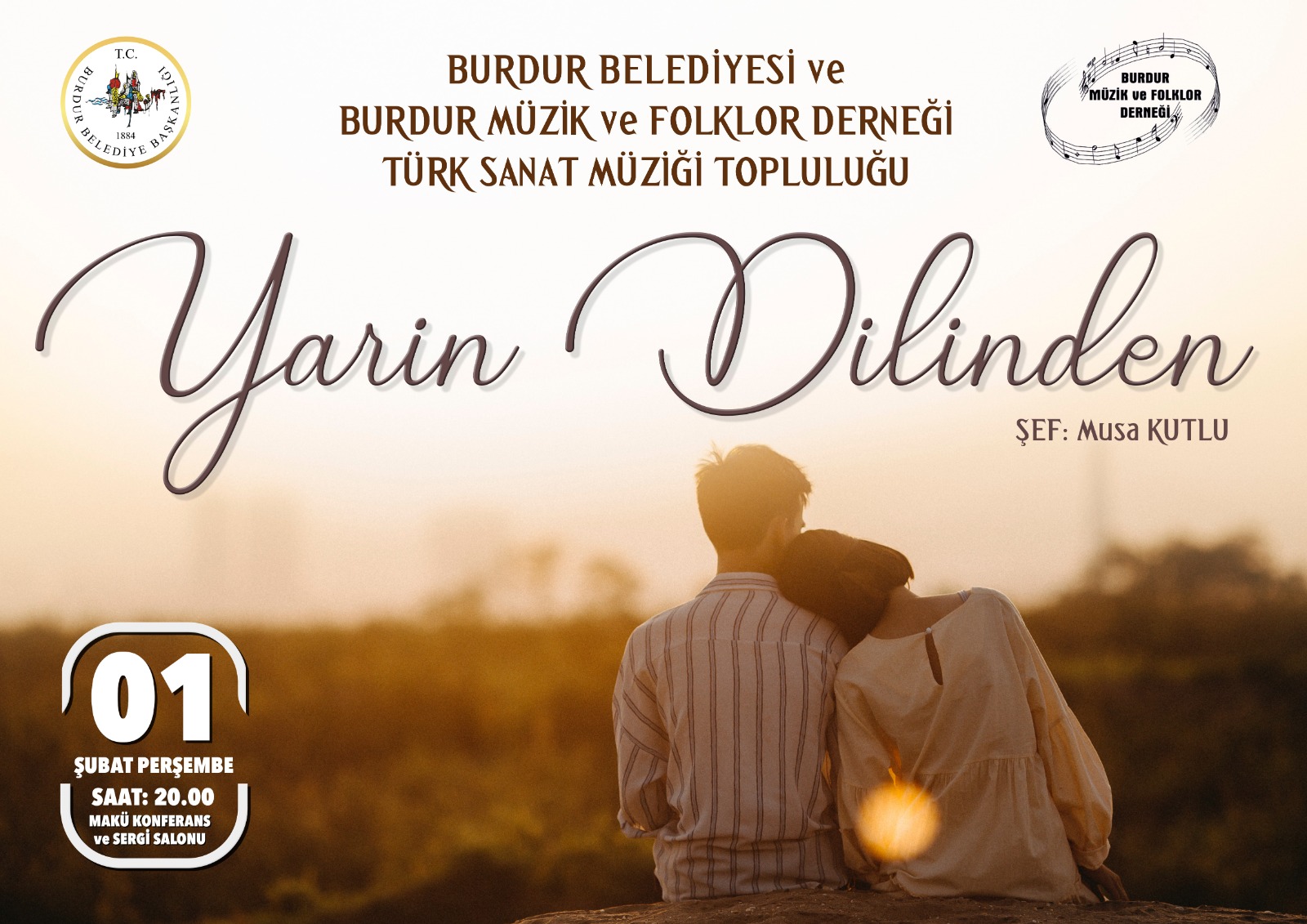 Burdur Belediyesi ve Burdur Müzik ve Folklor Derneği Türk Sanat Müziği topluluğu tarafından düzenlenen “Yarin Dilinden” türk sanat müziği konseri 1 Şubat 2024 Perşembe günü (yarın) Burdur halkı ile buluşuyor. Makü Konferans ve Sergi Salonu’nda saat 20.00’da düzenlenecek olan türk sanat müziği konserini koro şefi Musa Kutlu yönetecek. Burdur Belediye Başkanı Ercengiz konsere Türk Sanat Müziği seven bütün vatandaşları davet ederek, konserin ücretsiz olduğunu belirtti.