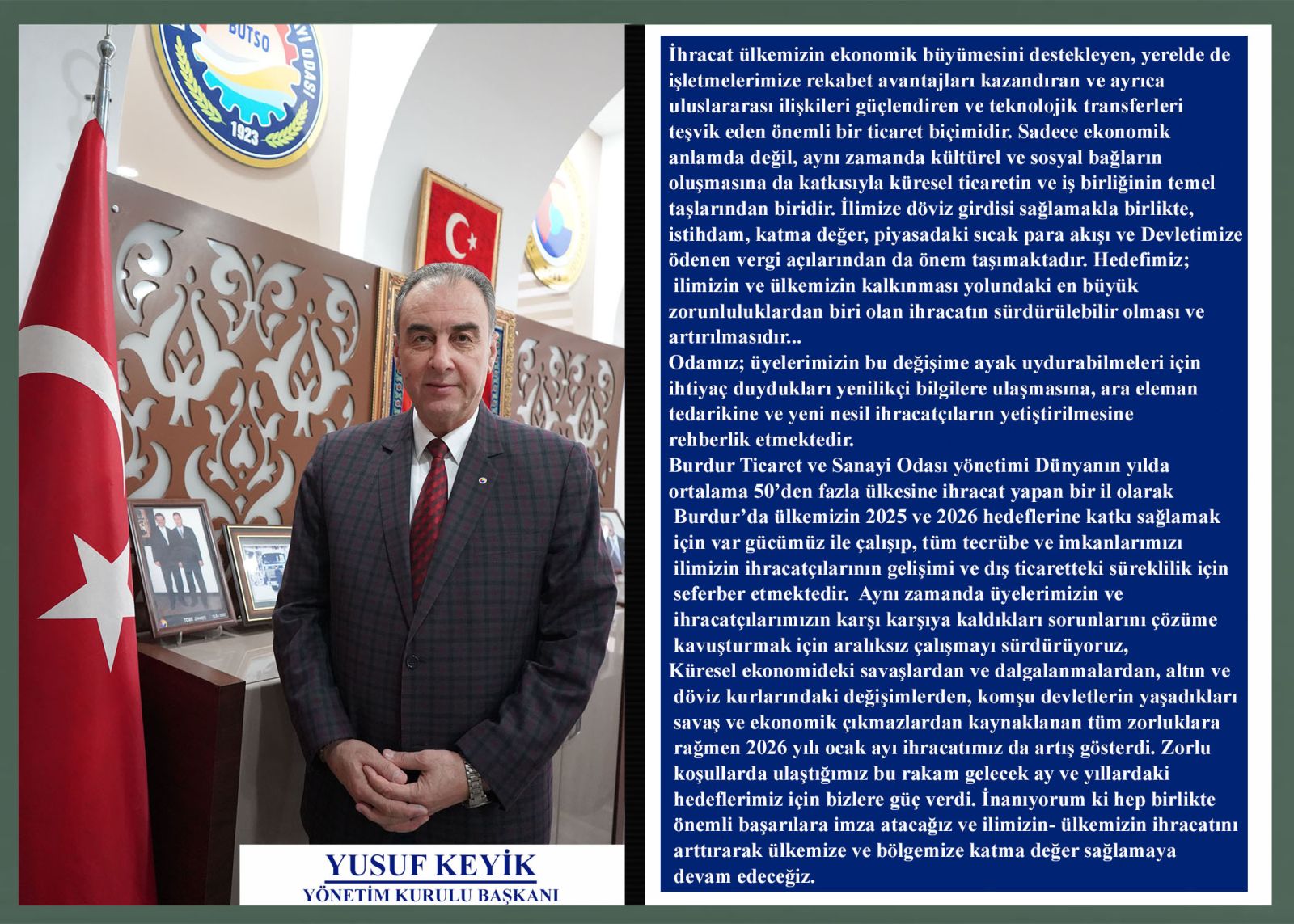 Burdur Ticaret ve Sanayi Odası Başkanı Yusuf KEYİK, aylık olarak Türkiye’nin ve Burdur’un güncel ihracat performansı değişimleri hakkında kamuoyunu bilgilendirmeye devam ediyor.