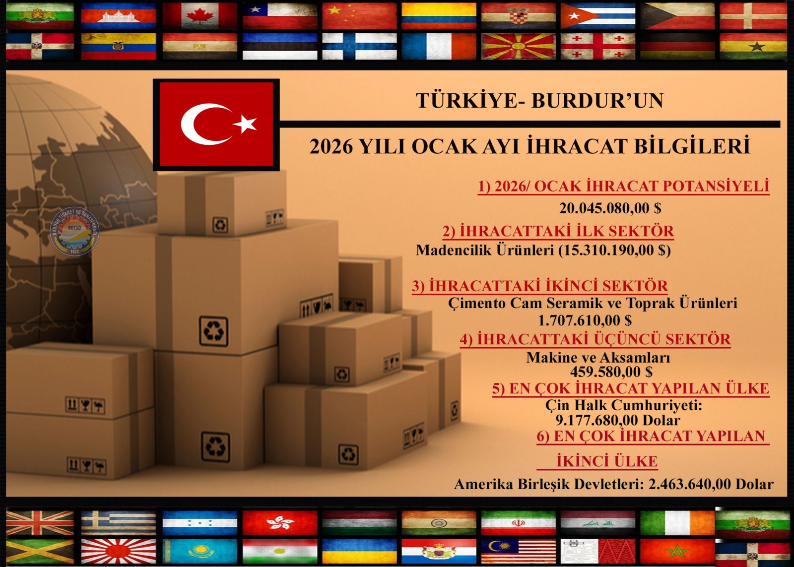 Burdur Ticaret ve Sanayi Odası (BUTSO) Yönetim Kurulu Başkanı Yusuf KEYİK: “Ocak ayında ilimizin ihracat hacmi bir önceki yılın aynı ayına göre %12,3’lük artışla 20 milyon 045 bin 080 dolardır. Serbest Bölgeler hariç 45 ülkeye ihracat yaptık. En fazla ihracatımızı yine ilimizin en çok dış ticaret yaptığı Çin Halk Cumhuriyeti’ne 9 milyon 177 Bin 680 dolar ile gerçekleştirdik” dedi.