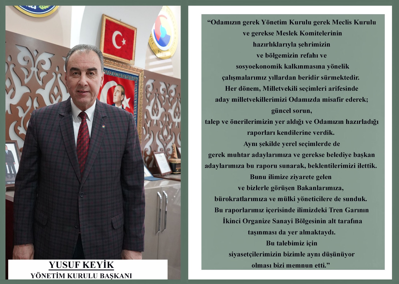 Başkan Yusuf KEYİK: “Odamızın gerek Yönetim Kurulu gerek Meclis Kurulu ve gerekse Meslek Komitelerinin hazırlıklarıyla şehrimizin ve bölgemizin refahı ve sosyoekonomik kalkınmasına yönelik çalışmalarımız yıllardan beridir sürmektedir. Her dönem, Milletvekili seçimleri arifesinde aday milletvekillerimizi Odamızda misafir ederek; güncel sorun, talep ve önerilerimizin yer aldığı ve Odamızın hazırladığı raporları kendilerine verdik. Aynı şekilde yerel seçimlerde de gerek muhtar adaylarımıza ve gerekse belediye başkan adaylarımıza bu raporu sunarak, beklentilerimizi ilettik. Bunu ilimize ziyarete gelen ve bizlerle görüşen Bakanlarımıza, bürokratlarımıza ve mülki yöneticilere de sunduk. Bu raporlarımız içerisinde ilimizdeki Tren Garının İkinci Organize Sanayi Bölgesinin alt tarafına taşınması da yer almaktaydı. Bu talebimiz için siyasetçilerimizin bizimle aynı düşünüyor olması bizi memnun etti” dedi.