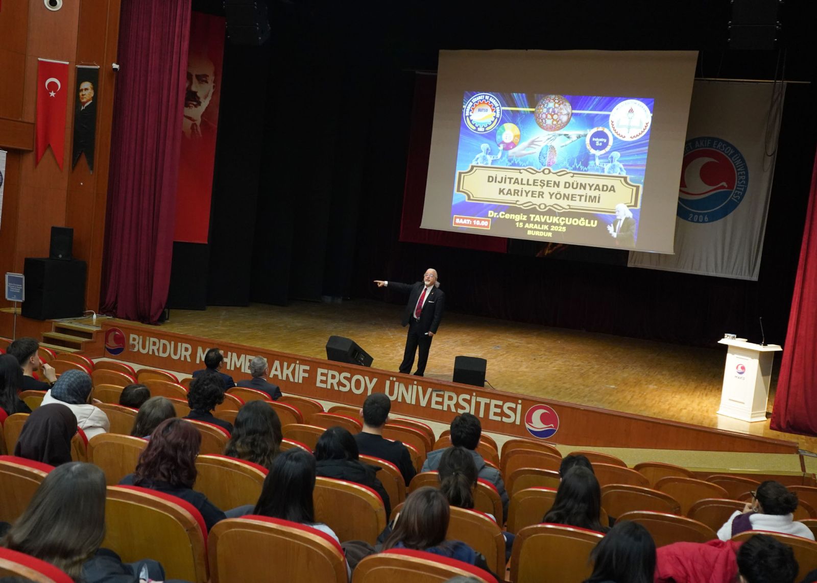 Değerli öğrenciler, sizler bizim için çok kıymetlisiniz. Üniversitedeki öğretmenlerin de sizlere ciddi katkılar sağladığını biliyoruz fakat değişim sürecindeki hayata dair dünyada değişen ve gelişen durumları görebilmemiz adına bugün değerli eğitimcimiz Dr. Cengiz Tavukçuoğlu ile sizleri buluşturduk. Sizlerin bizden Ticaret ve Sanayi Odası olarak talebiniz, isteğiniz, sorularınız, danışacağınız konularda da biz hazırız” şeklinde konuştu.