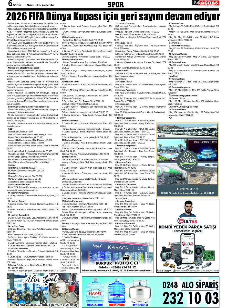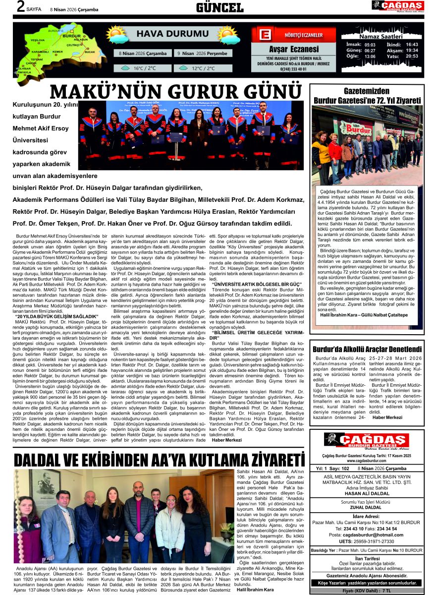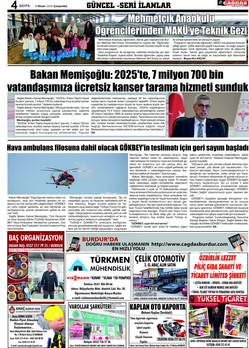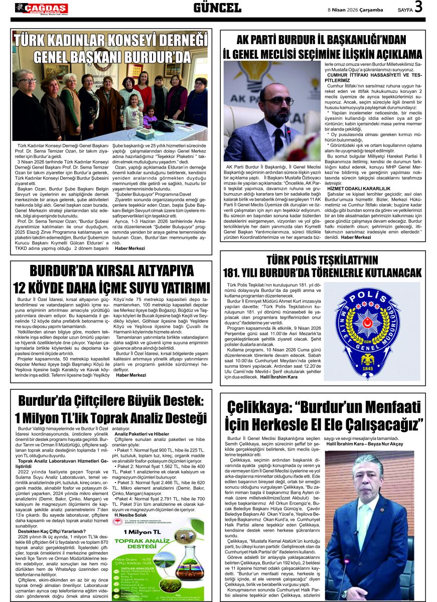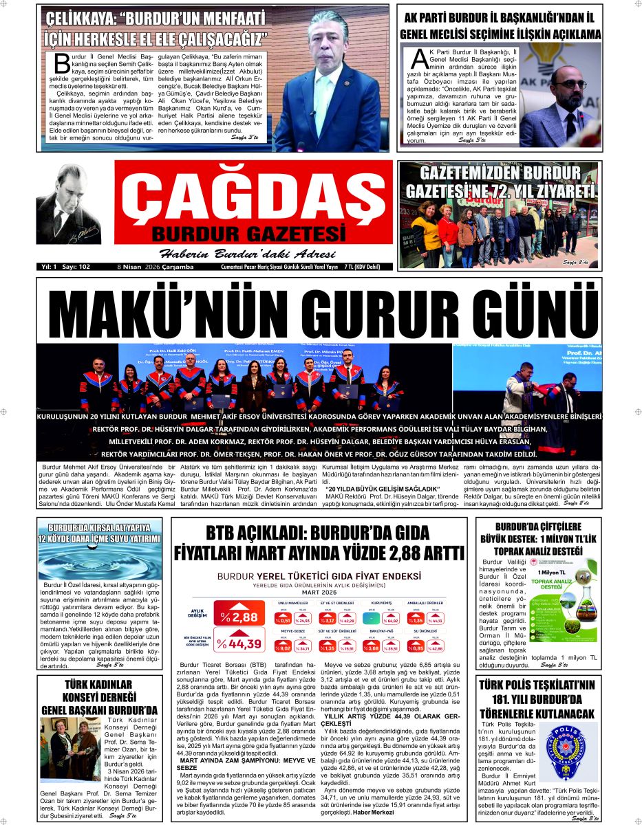 ÇAĞDAŞ BURDUR GAZETESİ'NİN GAZETEMİZ 8 NİSAN 2026 TARİHLİ SAYISI