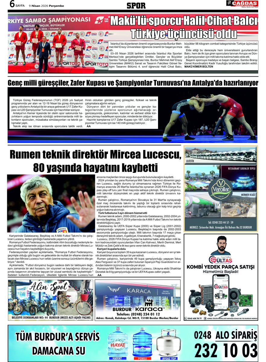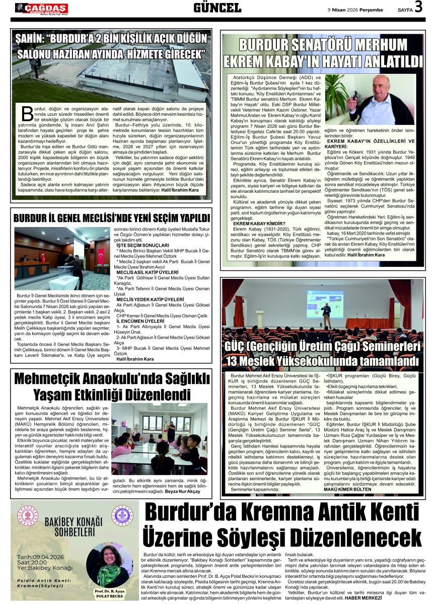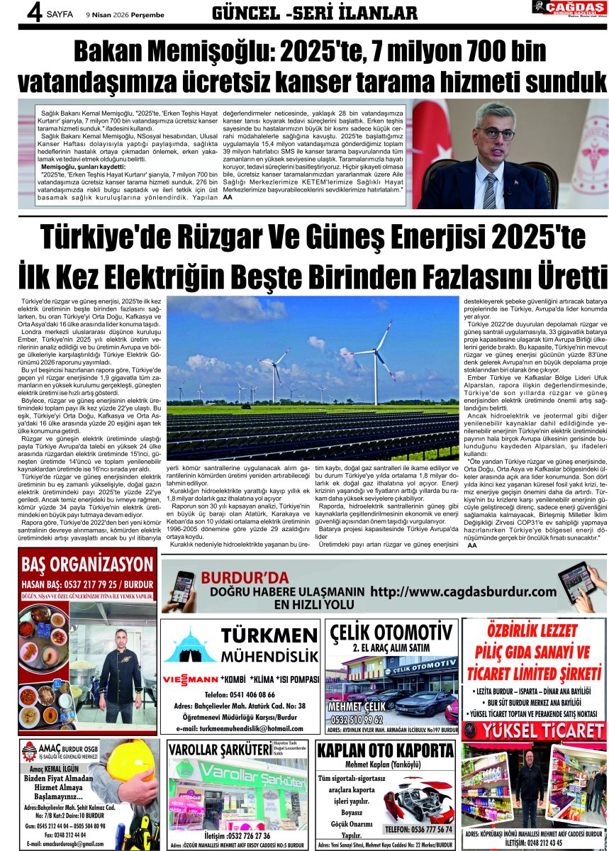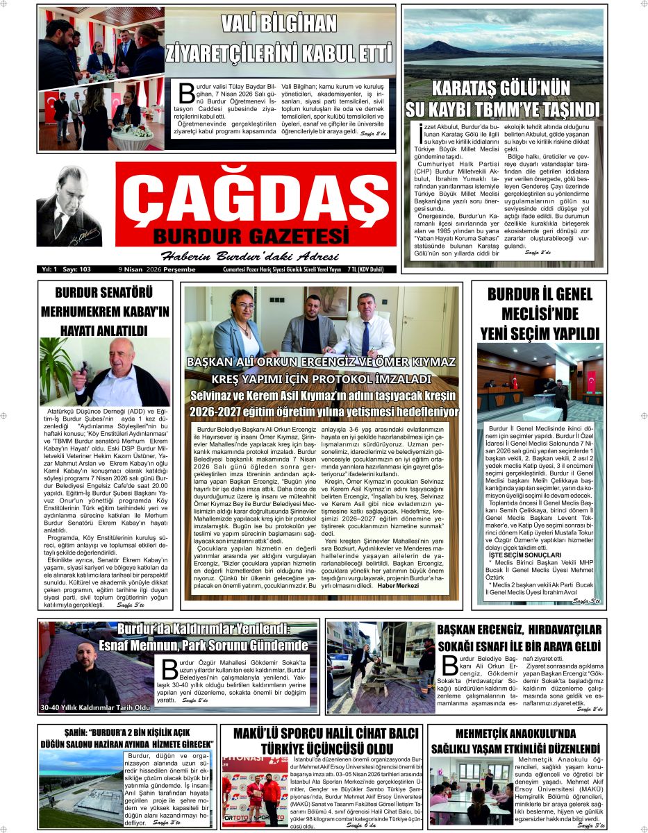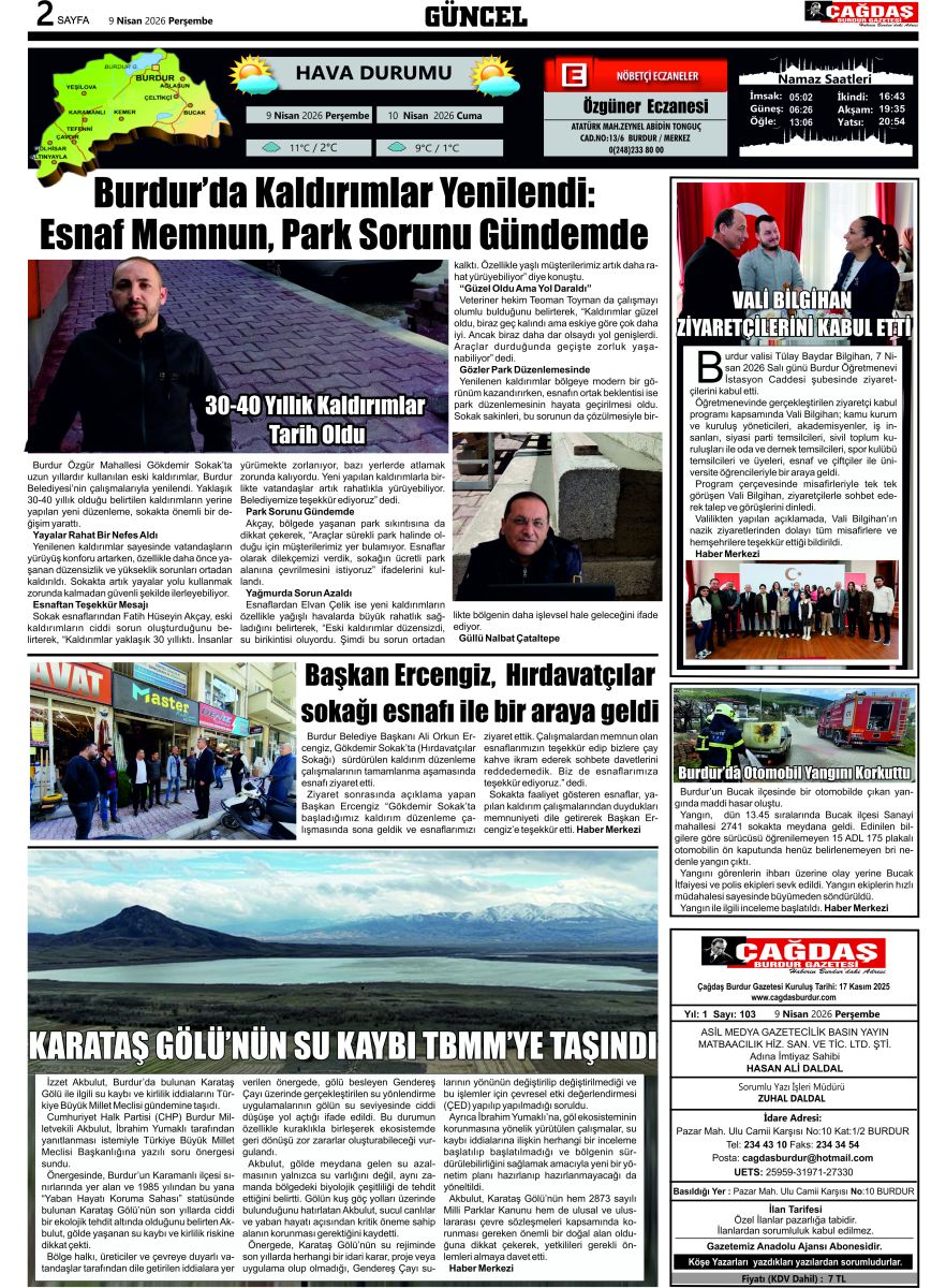 ÇAĞDAŞ BURDUR GAZETESİ'NİN GAZETEMİZ 9 NİSAN 2026 TARİHLİ SAYISI