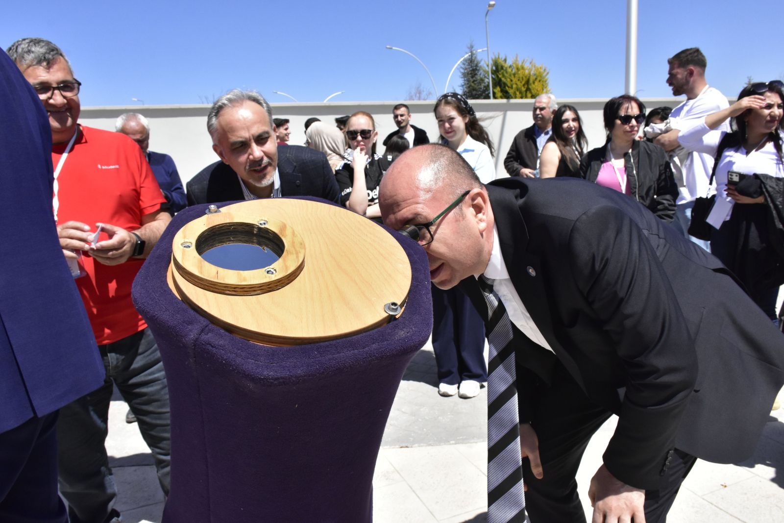 Etkinlik, 13:00–14:00 saatleri arasında düzenlenen Güneş Gözlem Şenliği ile devam etti. Katılımcılar, özel filtreli teleskoplar aracılığıyla Güneş’i detaylarıyla inceleme fırsatı buldu. Rektör Prof. Dr. Hüseyin Dalgar ve ekibi de şenlik alanına gelerek Günes’i inceledi.