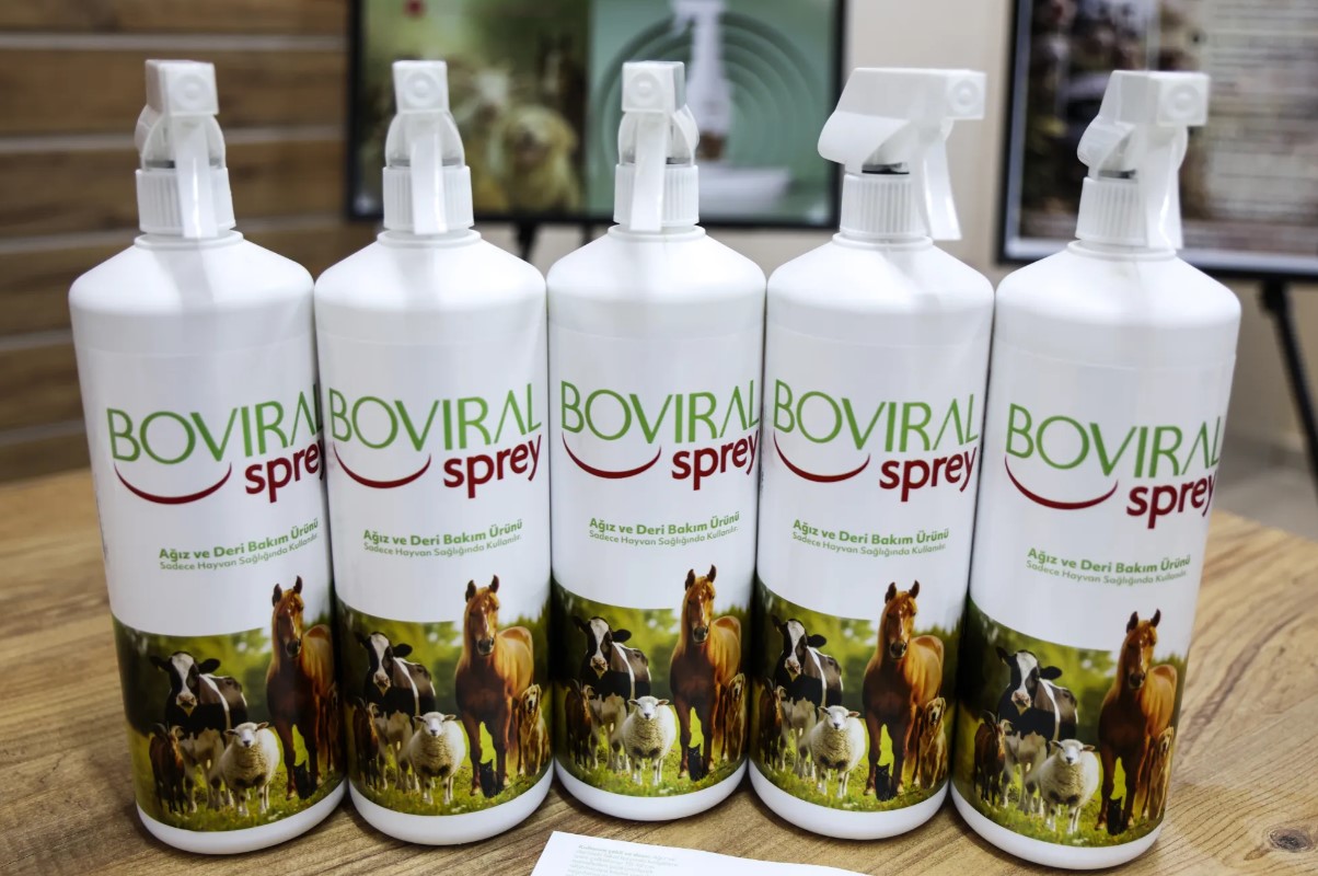 Dünyada hiçbir muadili olmayan Boviral Sprey hakkında açıklamalarda bulunan Kale; “Şap hastalığında hayvanın ağız yarası nedeniyle yem yeme isteği kaybolur. Biz de bu ürünün kısa sürede ağızda meydana getirdiği uyuşma hissi sayesinde hayvanın yaklaşık 15 dakika içerisinde yem yemesini sağlıyoruz. 3, 4 gün içerisinde; hayvan hem doyduğu için güçden düşmüyor hem de bağışıklığı sayesinde ve spreyin etken maddeleri sayesinde iyileşmiş oluyor.” dedi.