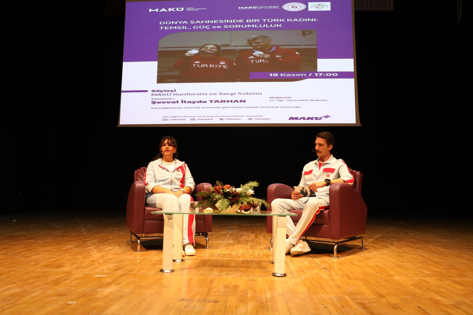 “Dünya Sahnesinde Bir Türk Kadını: Temsilcilik ve Sorumluluk” başlıklı söyleşinin moderatörlüğünü Spor Bilimleri Fakültesi Dr. Öğr. Üyesi Mert Nalbant üstlendi. Tarhan, hem spor hayatından kesitler aktardı hem de öğrencilerden gelen soruları yanıtladı.