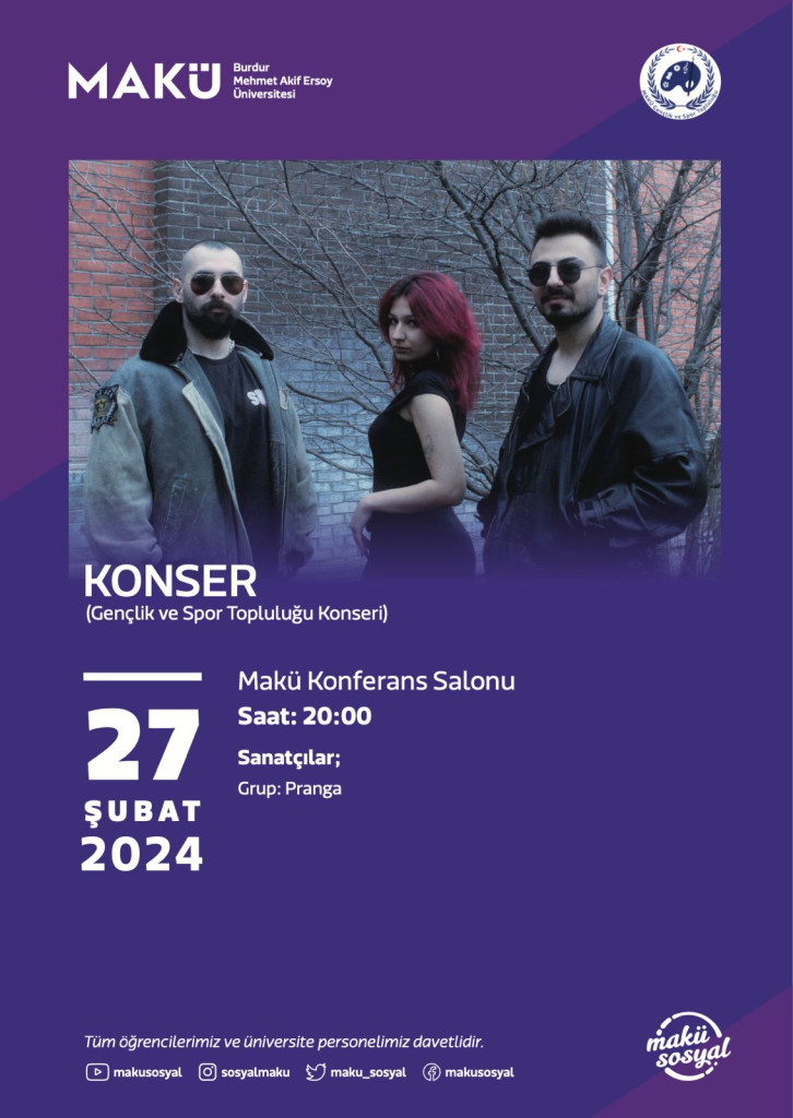 Mehmet Akif Ersoy Üniversitesi kültür ve sanat etkinlikleri kapsamında her sene çeşitli konserleri halkla ve öğrencilerle buluşturmaya devam ediyor. 27 Şubat 2024 Salı günü saat 20.00’da Gençlik ve Spor Topluluğu Konseri çerçevesinde konser verecek olan Grup Panga, Mehmet Akif Ersoy Üniversitesi Konferans Salonu’nda unutulmaz bir konsere imza atacak.