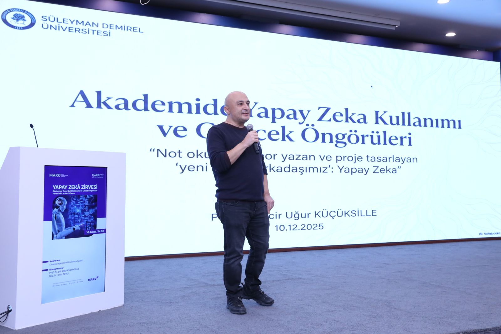 Isparta Süleyman Demirel Üniversitesi Öğretim Üyesi Prof. Dr. Ecir Uğur Küçüksille ise sunumunda, yapay zekânın hızla yayılan etkilerinden toplumun nasıl etkilenebileceğini ve olası riskleri anlattı. Yapay zekâ okuryazarlığının önemine dikkat çeken Küçüksille, teknolojiyi anlamayan bireylerin gelecekte iş ve sosyal yaşamda dezavantaj yaşayabileceğini söyledi.