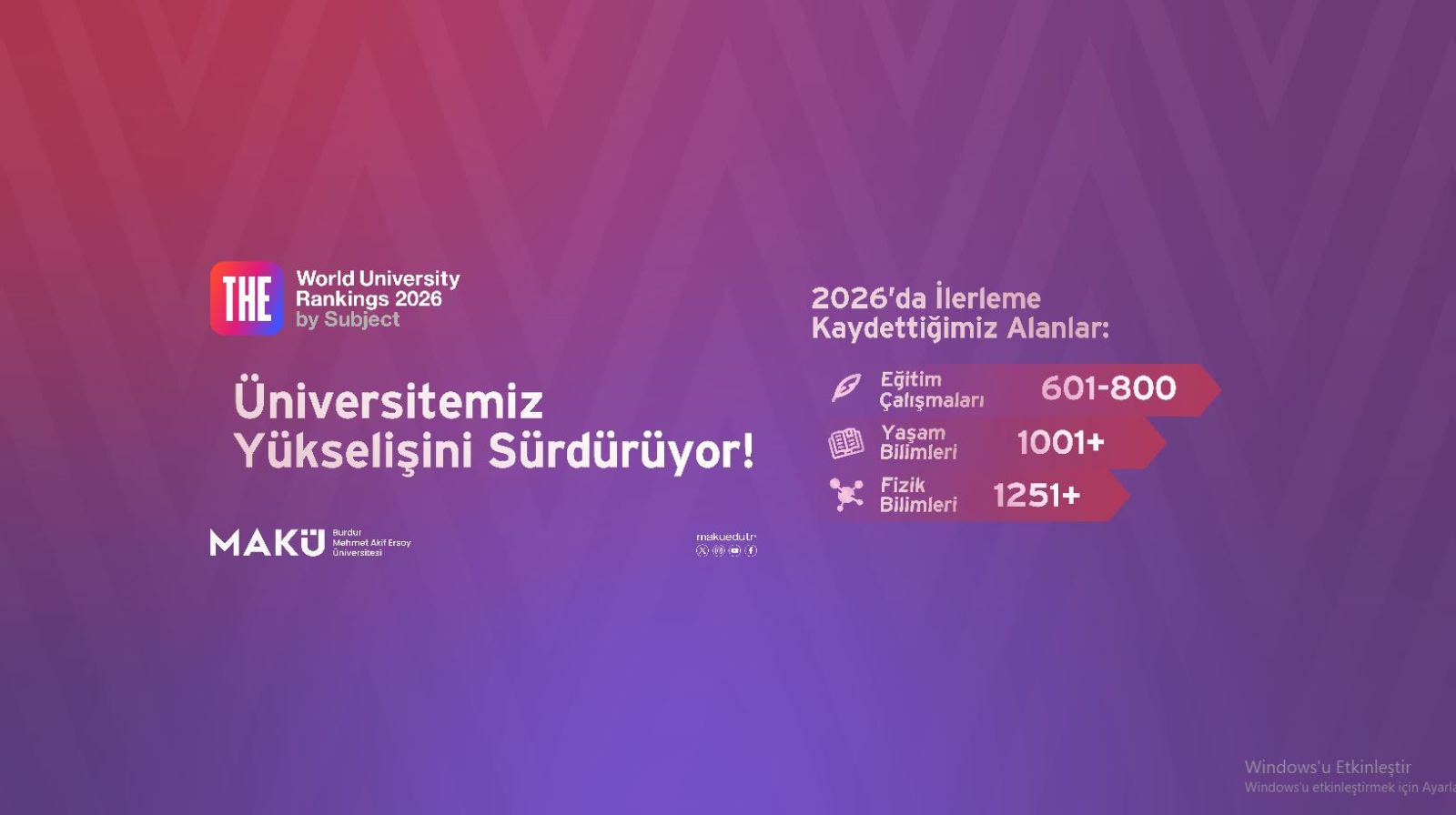 Burdur Mehmet Akif Ersoy Üniversitesi (MAKÜ), Times Higher Education (THE) tarafından açıklanan 2026 Alan Bazlı Dünya Üniversite Sıralamaları (THE by Subject) sonuçlarında önemli bir başarıya imza attı.