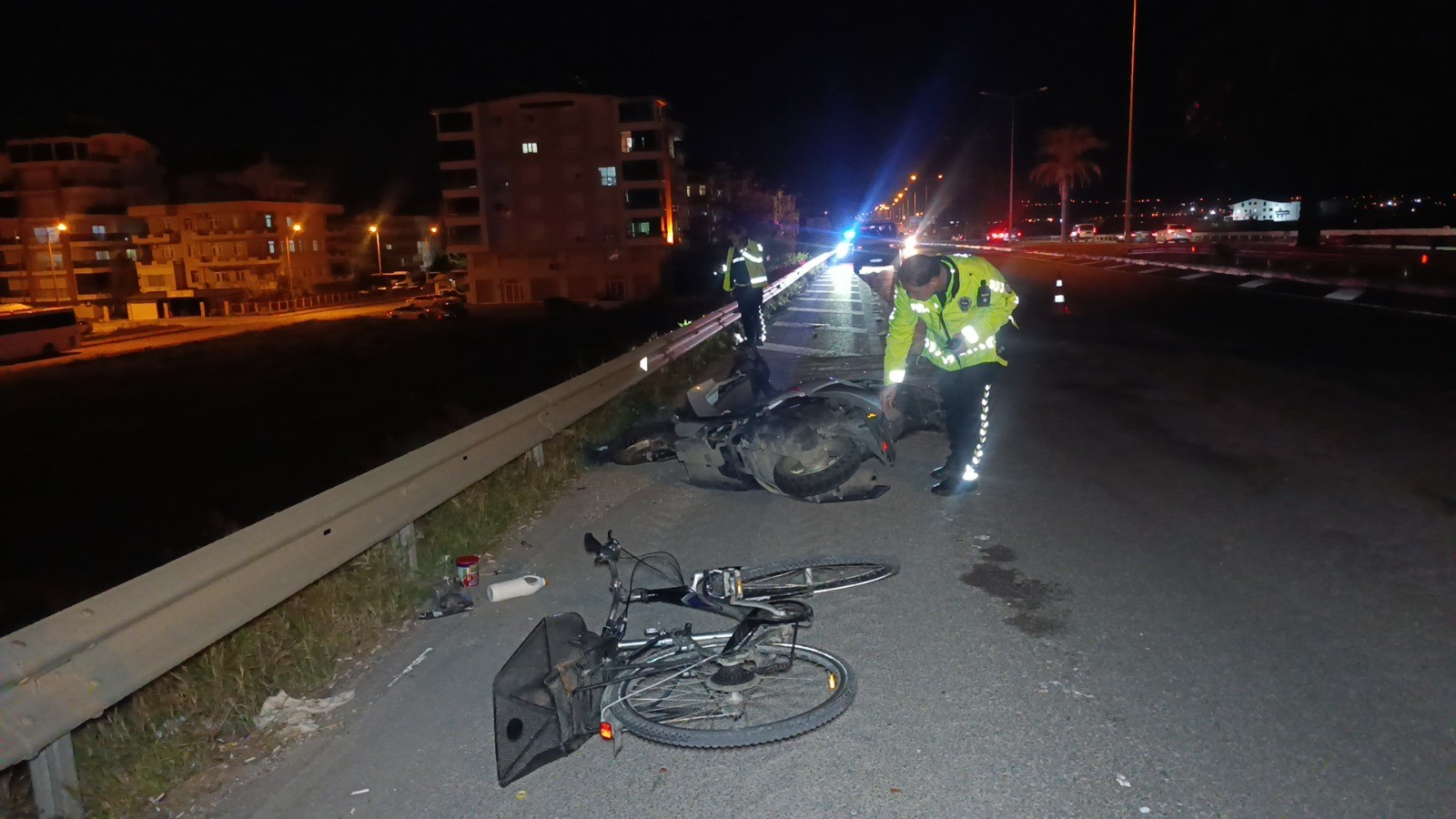 Manavgat ilçesi Alanya-Antalya D-400 Karayolunda meydana gelen kazada, Antalya istikametine seyir halindeki Muhammed O.’ın kullandığı 07 BZL 056 plakalı motosiklet, Manavgat Çevreyolu Köprüsüne yaklaştığı sırada aynı istikamette gitmekte olan Hasan S.’nin kullandığı bisikletle çapıştı. Motosiklet ve bisikletin yaklaşık 30 metre sürüklendiği kazada sürücüler yaralandı. Kazayı gören diğer sürücülerin 112 Acil Çağrı Merkezi’ne ihbarı ile olay yerine polis ve sağlık ekipleri sevk edildi. Yaralılar 112 sağlık ekiplerinin olay yerindeki ilk müdahalesinin ardından ambulansla hastaneye kaldırılırken, motosiklet sürücüsü Muhammed O. ve bisiklet sürücüsü Hasan S.’nin hayati tehlikesinin bulunduğu öğrenildi.