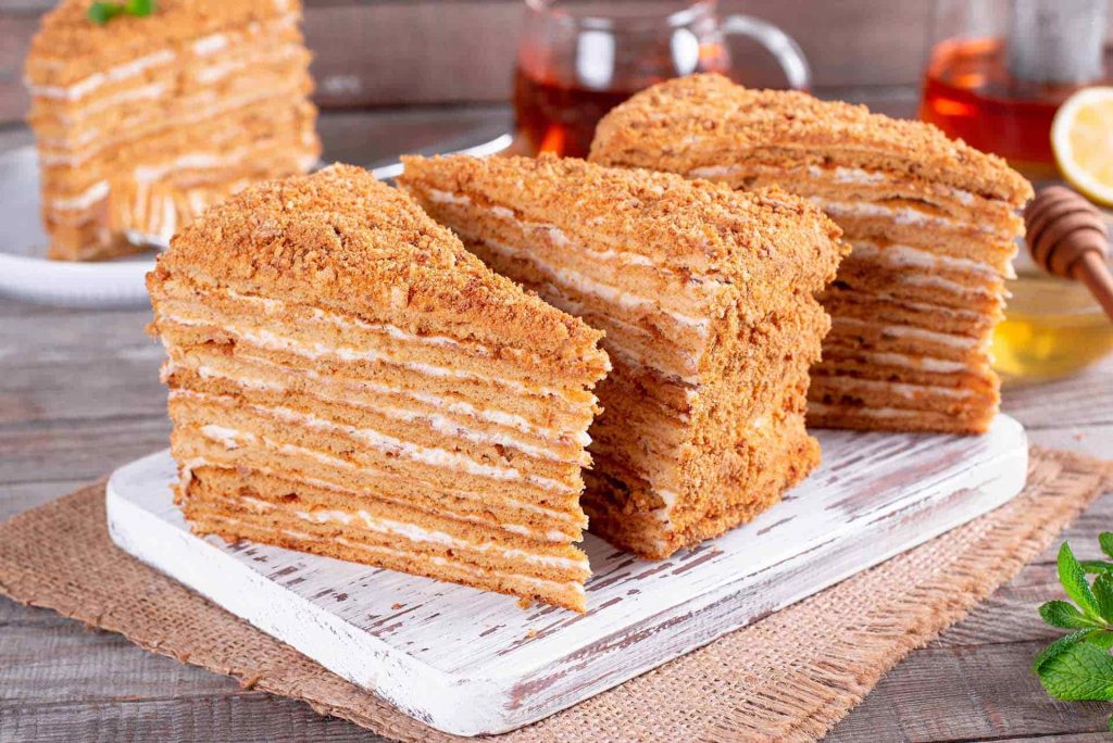 Süt kremasına, pudra şekeri ile köpürünceye kadar çırpalım. Kremaya bal ekleyerek tekrar çırpalım. 3. Üzerini streç film ile kapatarak buzdolabında bekletelim. Diğer taraftan hamurumuz için yumurta, toz şeker çırpalım. Tereyağını uygun bir tavaya alalım. Bal ekleyerek kısık ateşte eritelim. Daha sonra karbonat ekleyerek karıştıralım. Köpürdükten sonra ocaktan alalım. Hazırladığımız tereyağlı karışıma yumurtaya ilave edelim. Son olarak unu ekleyelim ve hafif ele yapışan kıvamda bir hamur elde edelim. Hamurumuzu unlanmış tezgaha alarak rulo haline getirelim. Mümkün oldukça eşit olacak şekilde sekiz parçaya bölelim. Her bir parçayı beze haline getirip merdane ile pasta tabağından büyükçe açalım. Pişirme kağıdını tepsiye serelim. Açtığımız hamuru tepsiye alalım. Önceden ısıttığımız 180 derece fırında hafif pembeleşinceye kadar yaklaşık 3-4 dakika pişirelim. Pişen hamurları soğumadan daire şeklinde keselim. Kenarların dan artan parçaları da bir tabakta biriktirelim. Katların arasına krema sürerek üst üste dizelim. Pastanın üzerini ve dışını da krema ile kaplayalım. Kenarlardan artan parçaları ronda da un haline getirelim. Ve pastamızın her tarafını kapatalım. Son olarak pastamızı buzdolabına kaldırarak 1 gece dinlendirelim. 10-12 dilim olacak şekilde pastanızı kesebilirsiniz. Medovik pastamızı üzerine bal gezdirerek servis edebilirsiniz.