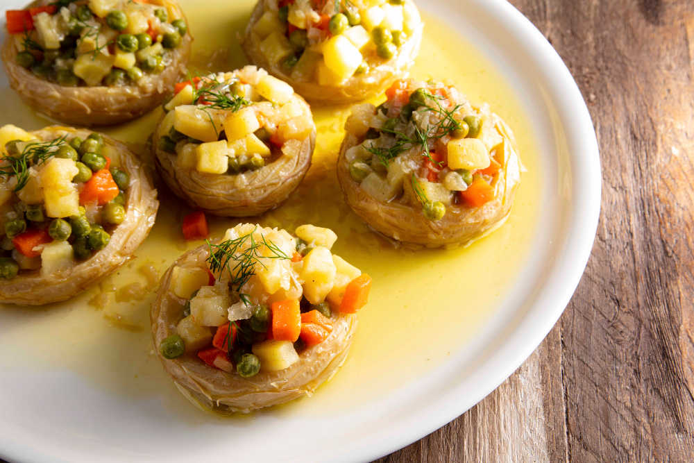 Enginar çanaklarınızın üzerine altta kalan soğanı gezdirin. Ardından hazırladığınız iç harcı üzerlerine pay edin. Portakalınızın suyunu sıkın ve enginarlarınızın üzerine gezdirin. Üzerine biraz zeytinyağı gezdirip tekrar kapağını kapatın ve kısık ateşte enginarlarınız yumuşayana kadar pişirin. Pişen enginarlarınızın üzerine ince kıyılmış dereotu serpiştirerek servis edin.