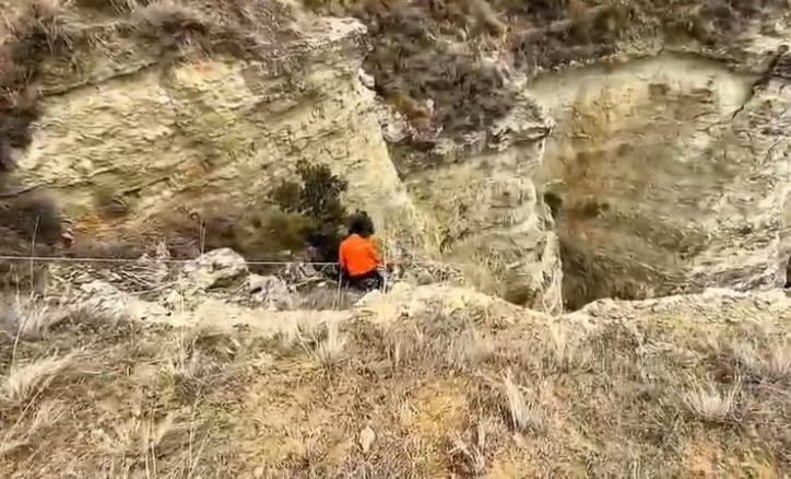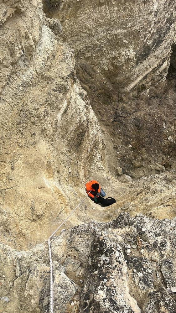 Burdur'da avcılar uçuruma düşen av köpeklerini kendi imkanları ile metrelerce derinlikteki uçuruma halatla inerek sağ salim çıkardı.