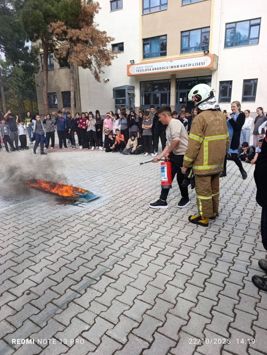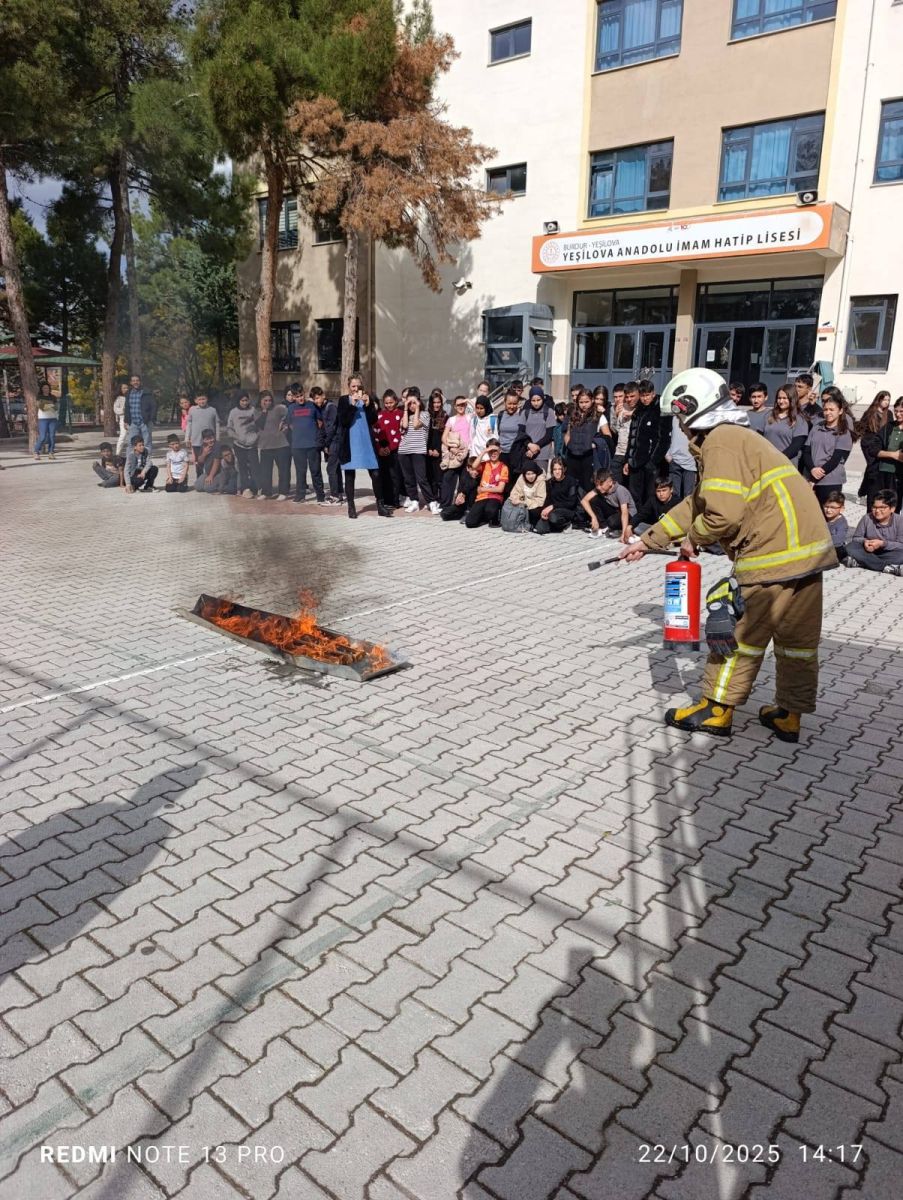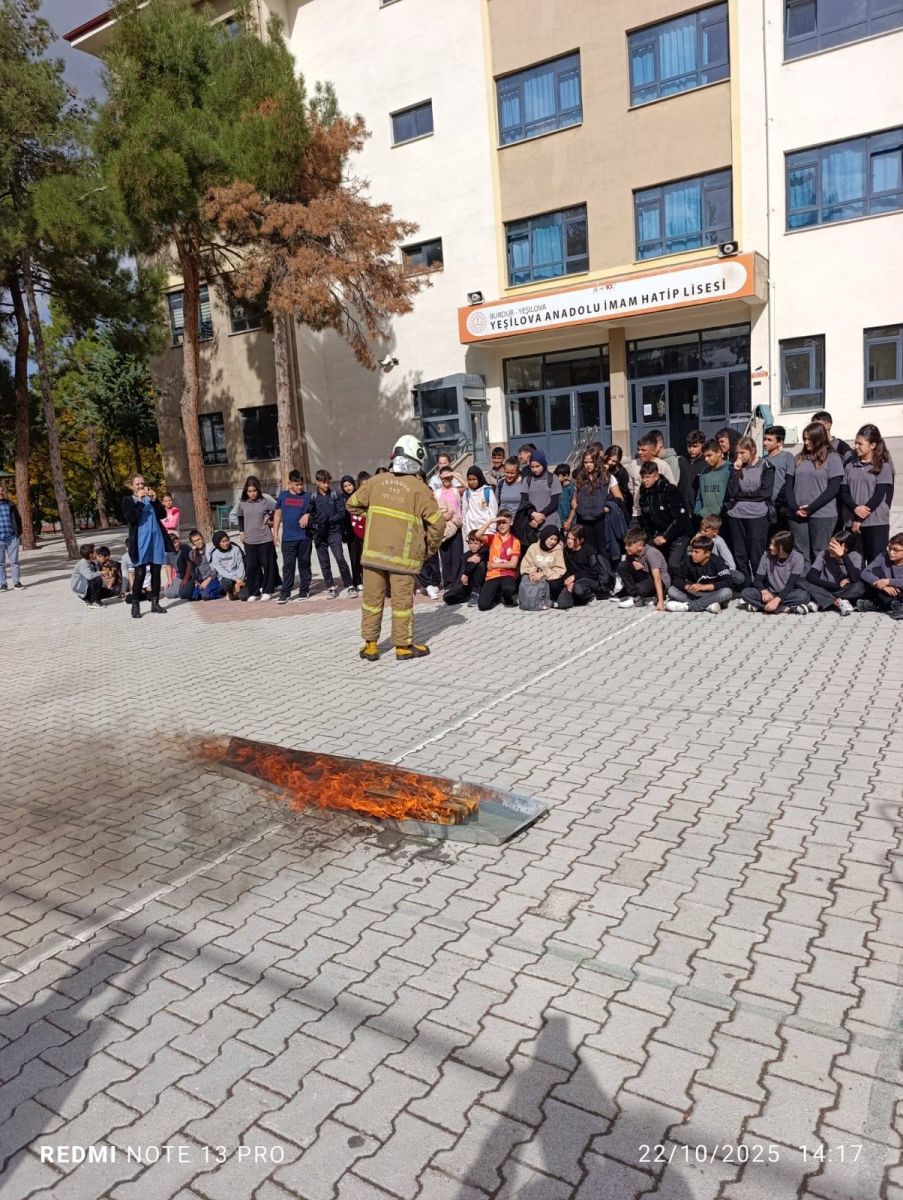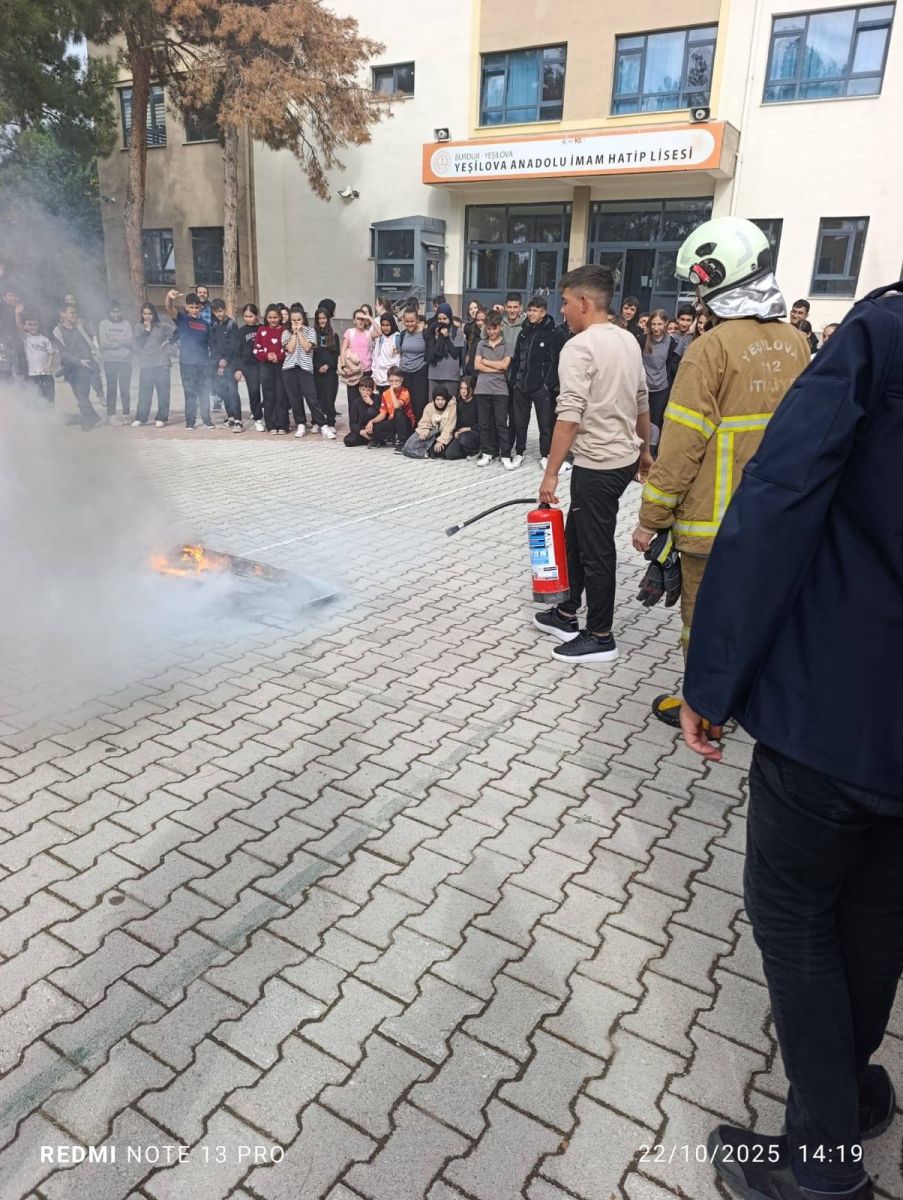 Burdur Yeşilova'da İtfaiye ekipleri, Anadolu İmam Hatip Lisesi öğrencileriyle yangın tatbikatı gerçekleştirdi.